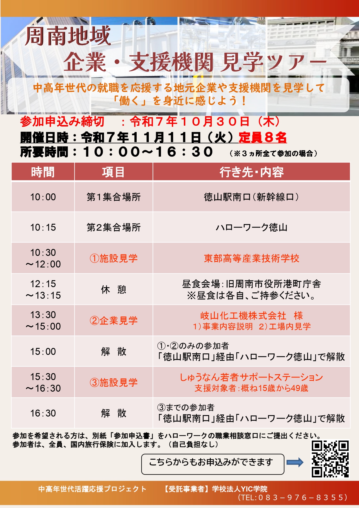 見学先:①山口県立東部高等産業技術学校 ②岐山化工機株式会社 ③しゅうなん若者サポートステーション(③のしゅうなん若者サポートステーションは支援対象年齢が15歳~概ね49歳)