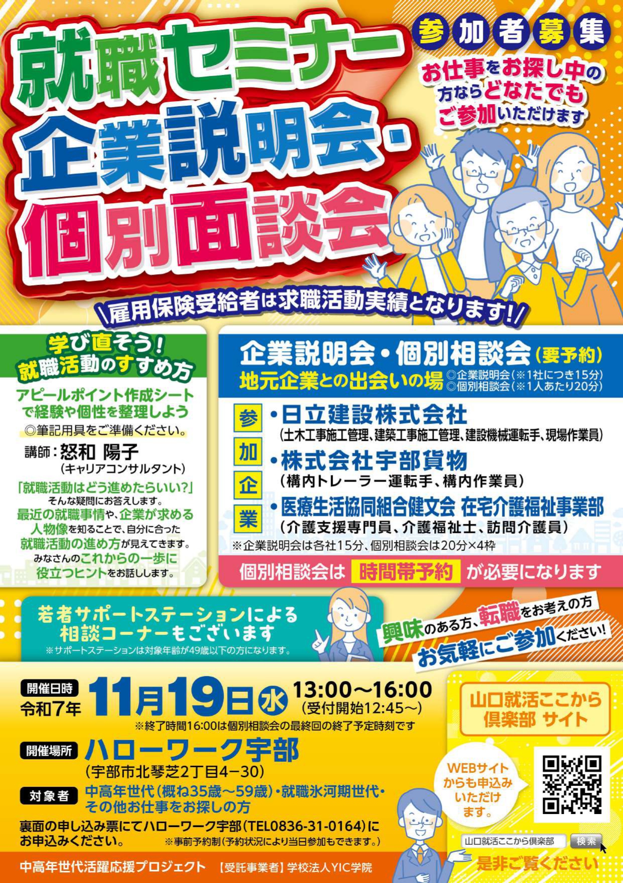 11月19日(水)ハローワーク宇部(宇部市北琴芝2丁目4−30)にて就職セミナー・企業説明会・個別面談を開催します。